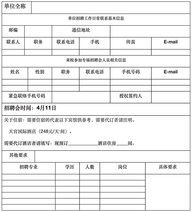 4、4月11日招聘会规模将控制在30家左右。如申请单位数量超过限制,我们将按接洽时间先后选定参会单位。