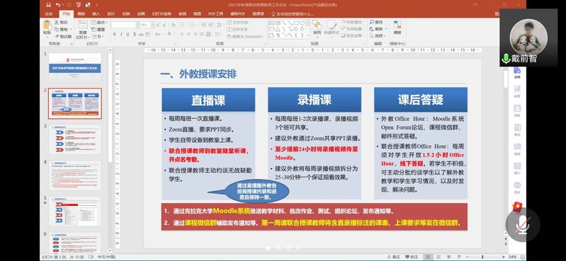 联合授课教师工作会议是AG真人官网中外合作办学项目的一项常态化工作,旨在加强对外教授课和联合授课教师助课的规范化和过程化管理,通过及时的问题反馈和解决,促进外教授课高质量平稳有序进行。同时,通过总结经验教训和集思广益,有助于不断探索实践线上线下教学新方法和新模式。