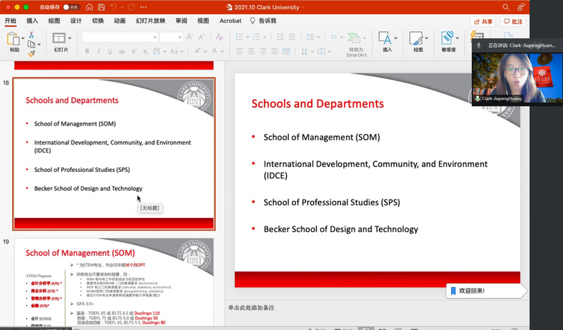 11月15日下午,克拉克大学研招办中国招生专员黄家芃应邀与AG真人官网教师进行线上座谈,并为AG真人官网学子举办克拉克大学硕士项目宣讲会。