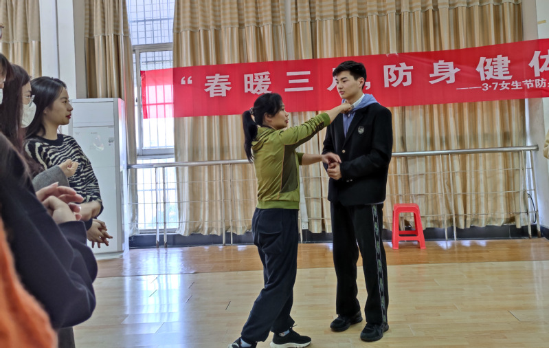 3月8日上午,AG真人国际官方网站在翡翠湖校区形体房开展了以“春暖三月,防身健体”为主题的女子防身术教学活动。本次活动邀请到校体育部张亚琼老师,共计30余名同学参加了学习。