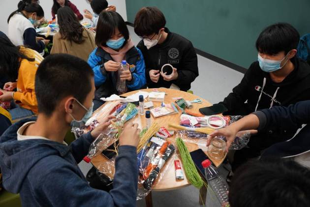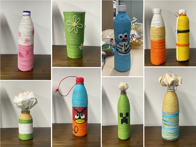 本期活动内容为废旧塑料瓶改造,活动负责人通过现场指导、视频讲解、图片分享等方式向大家具体讲解了装饰废旧塑料瓶的方法,讲解之后,活动参与同学利用麻线、剪刀、胶水等材料不断完善手中的作品,看着手中的废弃塑料瓶慢慢变为一个个漂亮的花瓶,学生纷纷表示很有成就感。