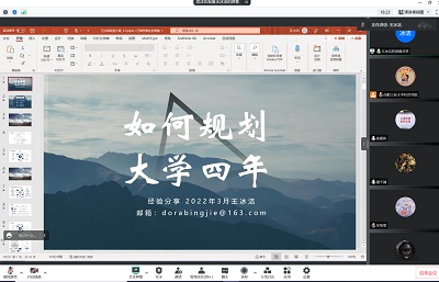 邱思敏同学围绕“怎样的大学故事才算精彩?”进行了分享,从学习能力、学生工作、社会实践、体育锻炼四个方面详细讲述了大一到大四的学习生活,强调了自主学习的重要性;王冰洁同学从专业学习、学术科研、实习经历、人际关系几个方面展开介绍,强调科学规划大学生活的重要性,同时结合自己的保研经历介绍了保研的基本流程和条件;杜雨航同学围绕中外合作办学项目的学习、生活经历给新生分享了在工大3年和克拉克大学2年的校园生活,建议同学们加强语言学习,合理规划时间。郑琦同学结合在校经历,鼓励学弟学妹们多参加学科竞赛和社会实践活动,在竞赛中积累经验,在实践中充实自己,不断提高综合素质。