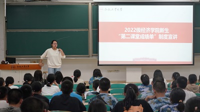 2021级本科生辅导员韩然然向学生系统介绍了“第二课堂”成绩单制度,详细讲解了“第二课堂”成绩单制度的建设背景、构成框架、管理评价和系统操作等几个方面的内容,现场教会学生们使用第二课堂成绩单操作系统,鼓励新生以“第二课堂成绩单”系统为平台,积极报名参加各种类型的比赛活动,实现综合素质的全面提升。