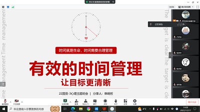 12月17日,2022级国贸3班开展了以“如何进行有效的时间管理”为主题的线上心理主题班会。心理委员韩明哲主持会议,班级全体同学出席了会议。
