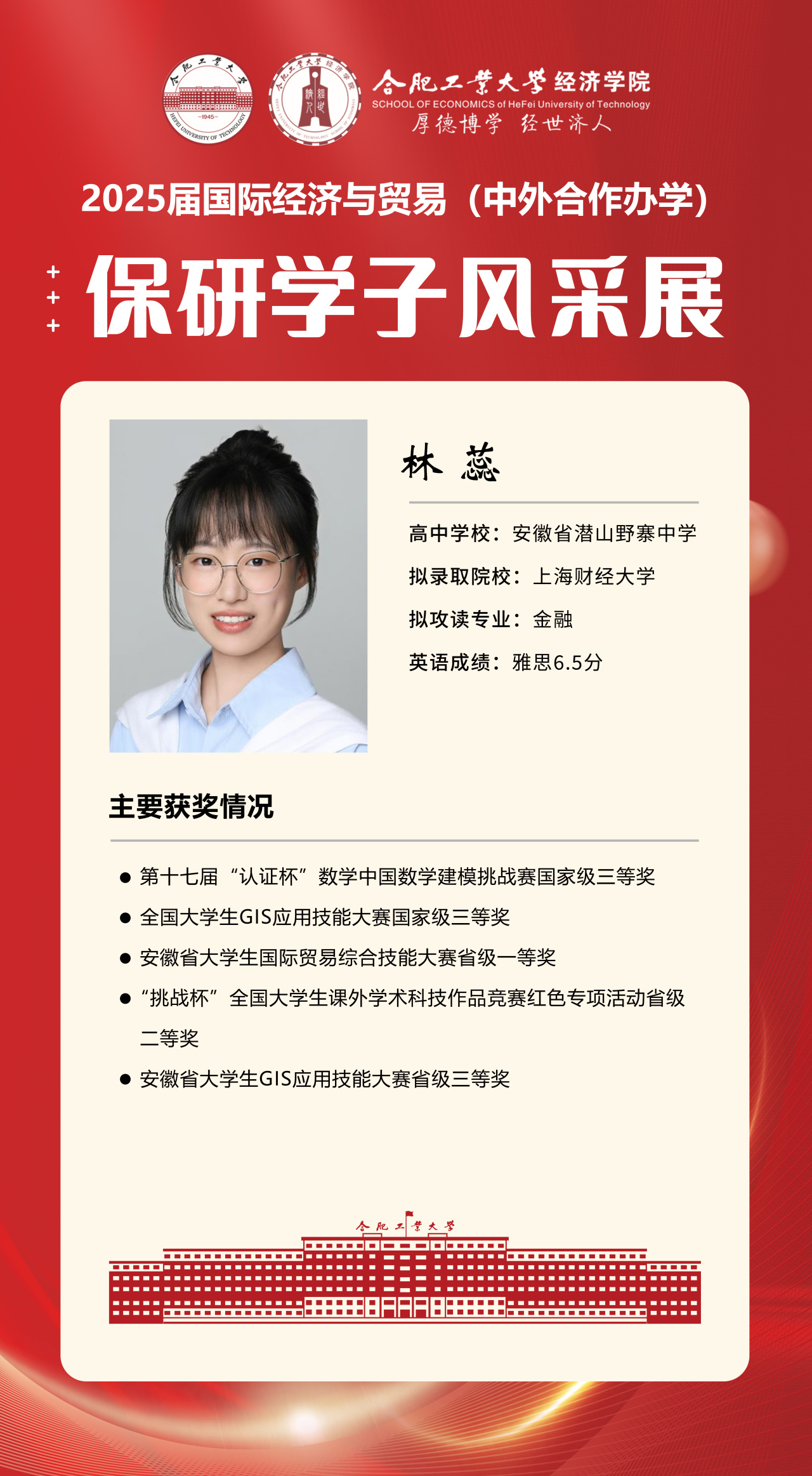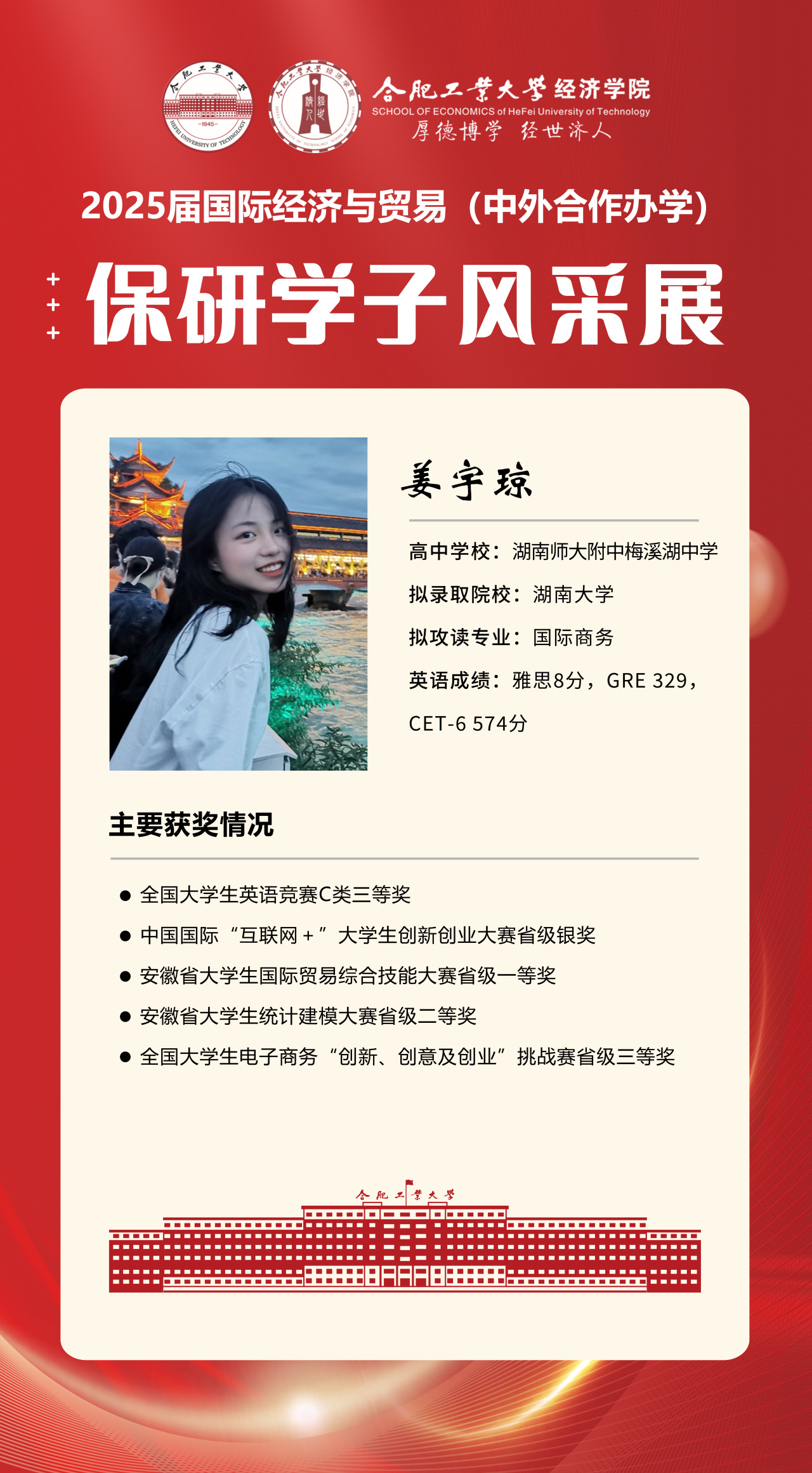 2025届AG真人国际官方网站国际经济与贸易(中外合作办学)15名优秀推免生全部成功推免至中国科学技术大学、上海财经大学、对外经济贸易大学等“双一流”名校继续深造,充分展现了“强语言、精专业、通规则、能跨界”的培养特色。下面我们一起来看看推免学子的风采吧!